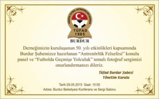 TÜFAD Burdur Şubesinden Panel ve Fotoğraf Sergisi![]() 29.05.2015 Cuma Günü Saat 15:00'te TÜFAD Burdur Şubesi'nin düzenlemiş olduğu Antrenörlük Semineri , Panel ve geçmişten günümüze Burdur'da Futbol Fotoğraf Sergisine tüm hakem ve gözlemcilerimiz davetlidir. Seminerde vefat eden TÜFAD Burdur Şube Başkanı ve il gözlemcilerimizden Nurhan ÇİFTÇİBAŞI'da anılacaktır. Yer: Burdur Belediyesi Sergi ve Konferans Salonu ( Arka Bölüm ) İHK ![]() |